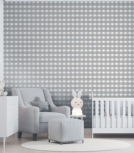 PÁG. 22 - Papel de Parede Xadrez Vichy Cinza - Coleção Revoada Bobinex - Vinílico Importado