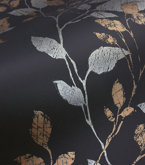 PÁG. 35 - Papel de Parede Folhagem Preto, Cobre e Champanhe Brilho - Coleção Entre Linhas - Vinílico Importado